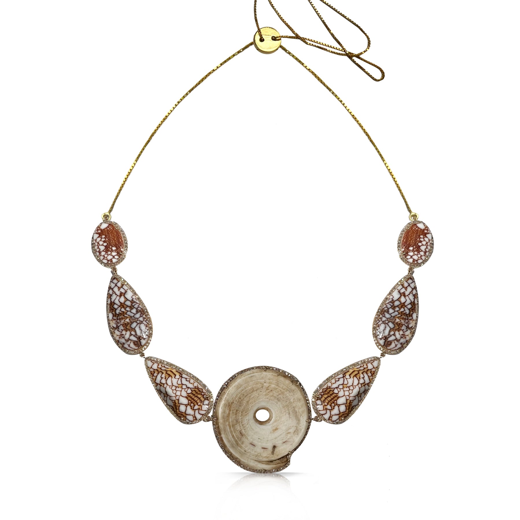 • Conus and Spiney Oyster Shells surrounded by pave diamonds and set in 14k yellow gold.