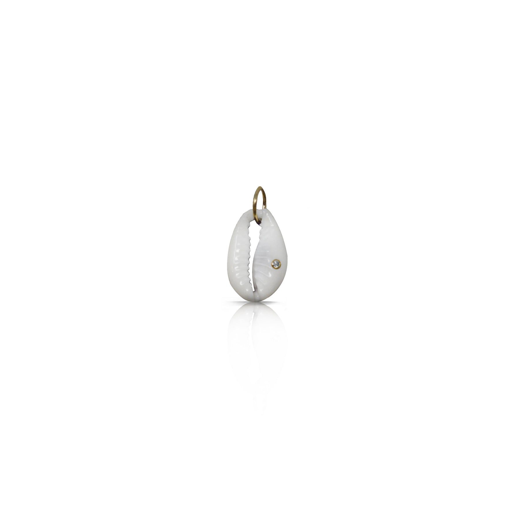 The 14k cowrie shell charm by S. Carter Designs showcases a unique cowrie shell charm, complemented by a 4mm bezel set white diamond and a 14k yellow gold bale. This diamond pendant measures approximately 1 inch, offering a blend of elegance and natural beauty.