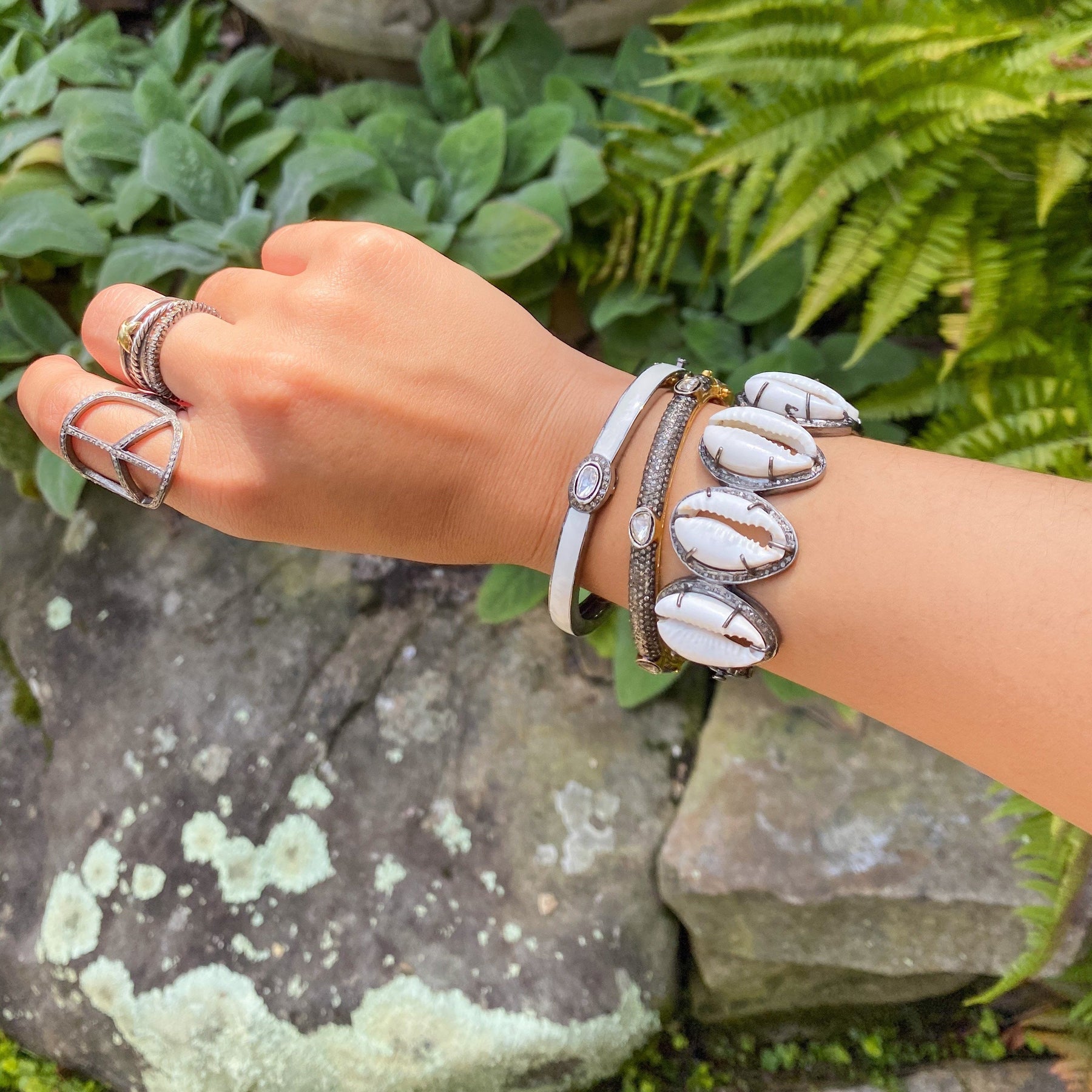 This plain white enamel bangle features two pave rosecut buttons at its center, offering a sleek and sophisticated look. The bracelet's circumference measures 6.5 inches, providing a comfortable fit. For inquiries about custom sizes, please contact info@scarterdesigns.com.